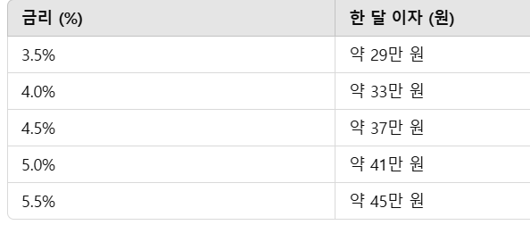 ✔️ 금리 4% 기준, 한 달 이자 약 33~34만 원